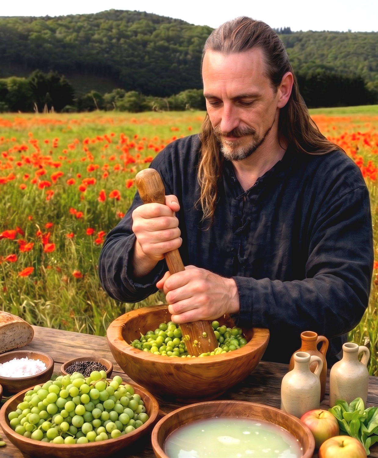 Verjus maken., Verjus is het sap van groene onrijpe druiven. Niet zo zuur als citroen maar wel met fruitiger geur en smaak.
