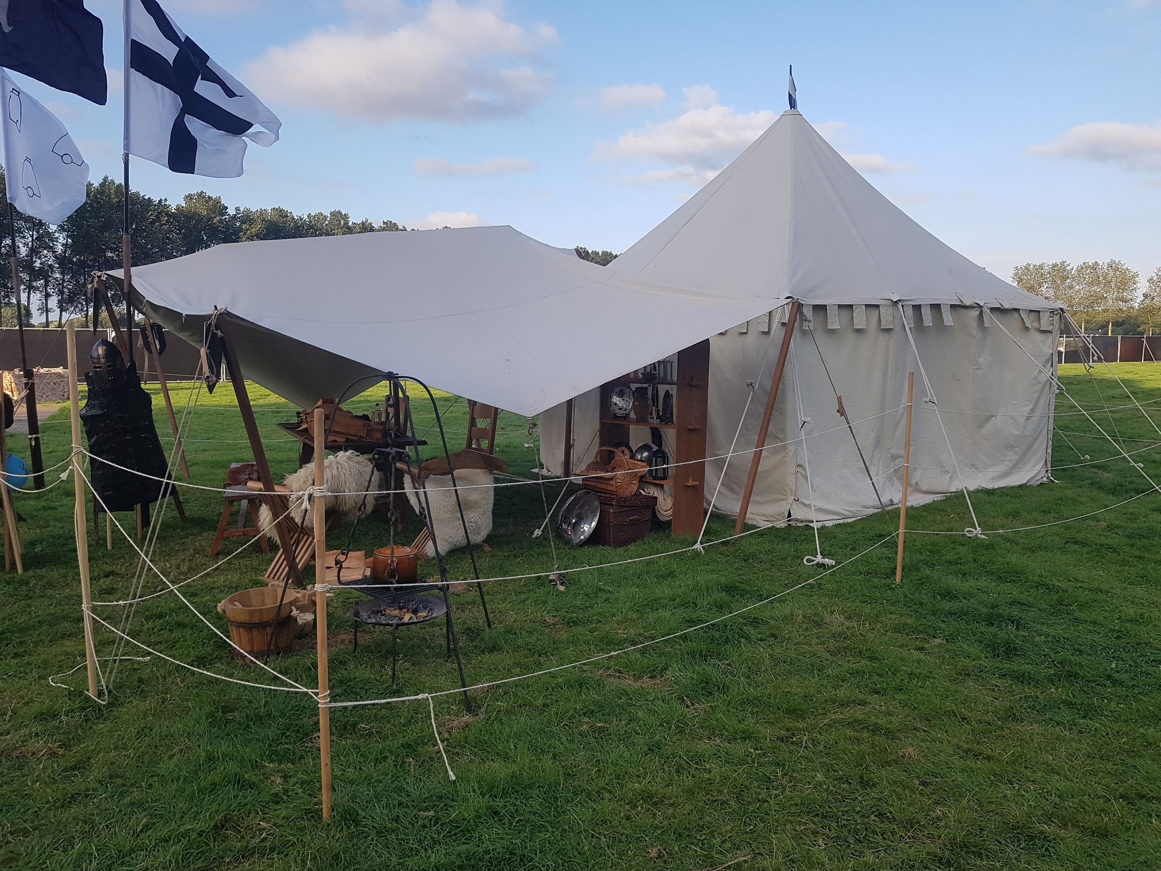 Toernooiveld met extra decor; talrijke heraldische wapenschildjes en vlaggen. Tent, luifel, marktkraam,enz...